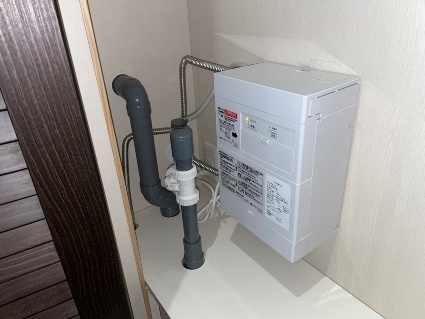 単水栓ですが電気温水器(TOTOさんの湯ポット)を設置し、お湯が出る様にしてあります。